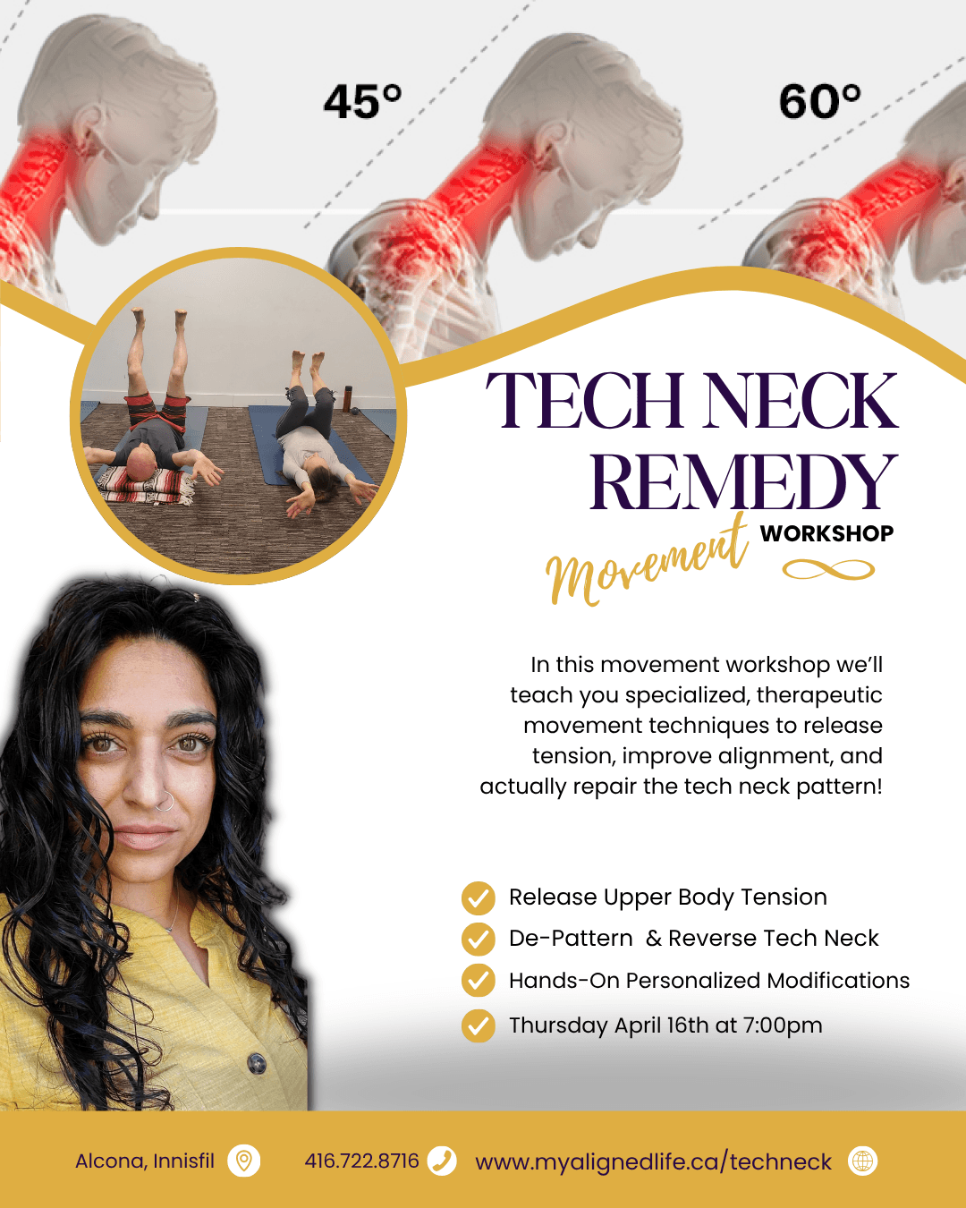TECH NECK REMEDY Movement workshop is designed to help you create more space, ease, and mobility in & around your neck, shoulders and upper back.